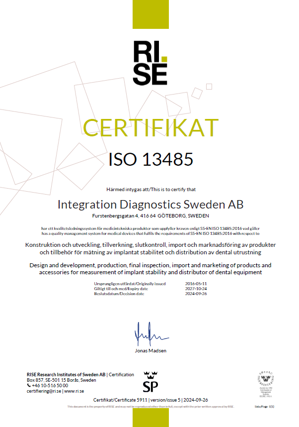 In 2015, in response to the dental community’s need for an accessible ISQ measuring system, Integration Diagnostics Sweden AB (IDSAB) was founded. The company’s management consists of the same people who started the Osstell company back in 1999.